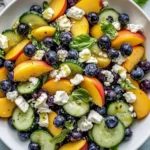 A refreshing summer salad featuring blueberries, peaches, cucumbers, and feta cheese, dressed with a zesty vinaigrette.