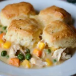 A comforting chicken pot pie topped with flaky biscuits, perfect for a cozy meal.