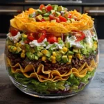 This Seven-Layer Taco Salad layers seasoned beef, fresh veggies, creamy guacamole, and crisp lettuce with a hint of spice. It’s an easy-to-make, crowd-pleasing salad that brings a touch of fiesta to any table. Serve with tortilla chips for scooping or enjoy it as a standalone meal!