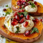 A vibrant and delicious recipe for Sweet Potato Toast topped with creamy burrata cheese and fresh pomegranate seeds, perfect for any occasion.