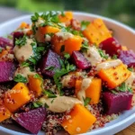 A vibrant salad featuring roasted beets, sweet potatoes, and quinoa, drizzled with a tangy lemon tahini dressing.